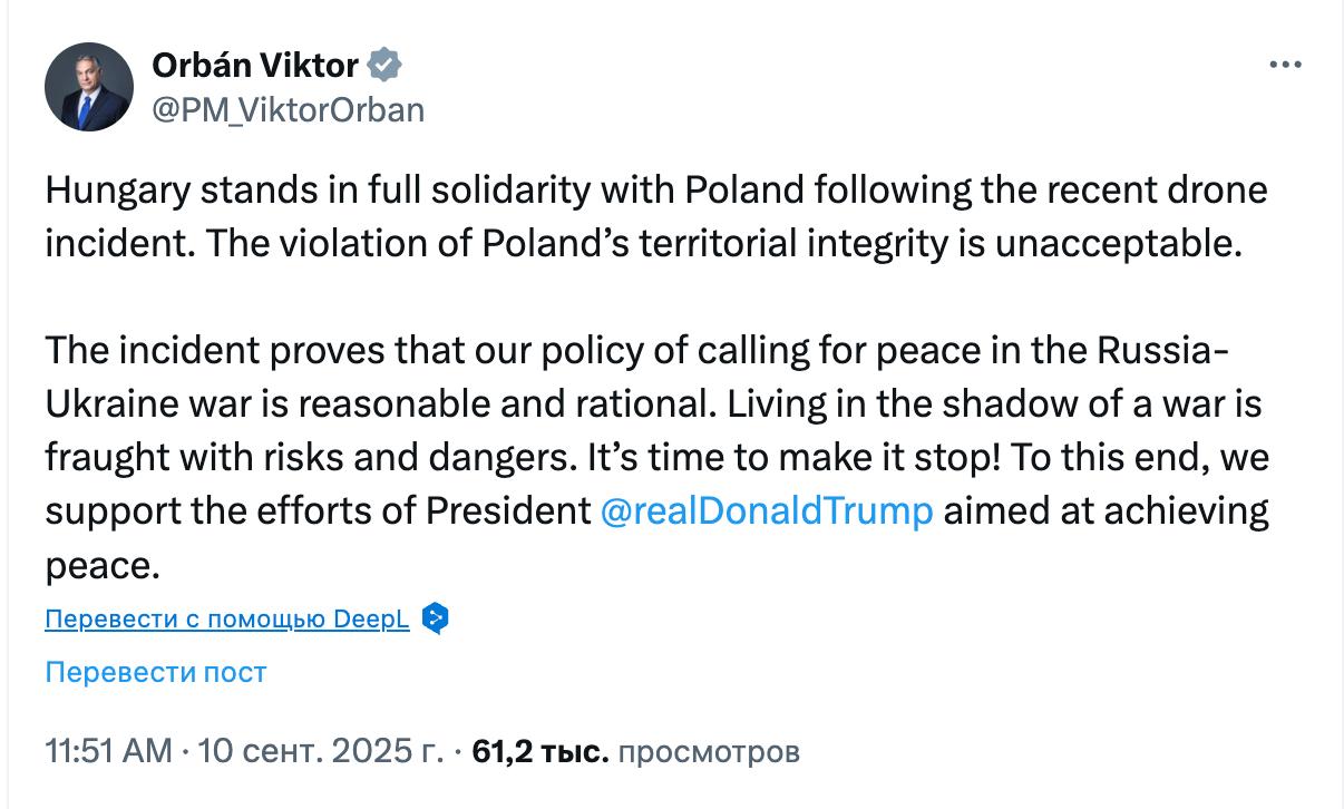 "Венгрия полностью солидарна с Польшей после недавнего инцидента с дроном. Нарушение территориальной целостности Польши неприемлемо. Этот инцидент доказывает, что наша политика призывов к миру в войне между Россией и Украиной является разумной и рациональной. Жизнь в тени войны чревата рисками и опасностями. Пора положить этому конец. С этой целью мы поддерживаем усилия президента Трампа, направленные на достижение мира", - написал премьер Венгрии.
