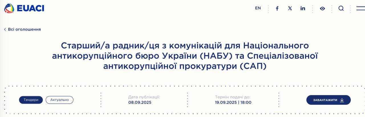 Вакансия размещена на сайте EUACI - антикоррупционной инициативы Евросоюза в Украине.