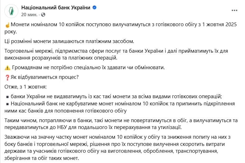 "Эти разменные монеты остаются платежным средством. Торговые сети, предприятия сферы услуг и банки Украины и дальше будут принимать их для выполнения расчетов и платежных операций. Гражданам не нужно специально их сдавать или обменивать", - говорится в сообщении.