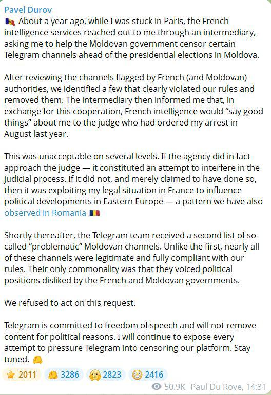 Вскоре после этого команда Telegram получила второй список так называемых "проблемных" молдавских каналов. В отличие от первого, почти все эти каналы были легитимными и полностью соответствовали нашим правилам. Их единственным общим признаком было выражение политических позиций, неугодных французскому и молдавскому правительствам. Мы отказались выполнять эту просьбу (заблокировать каналы - Ред.)", - пишет Дуров.