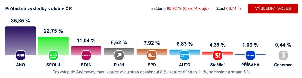 На момент подсчёта 96% бюллетеней у партии ANO 35,3% голосов.