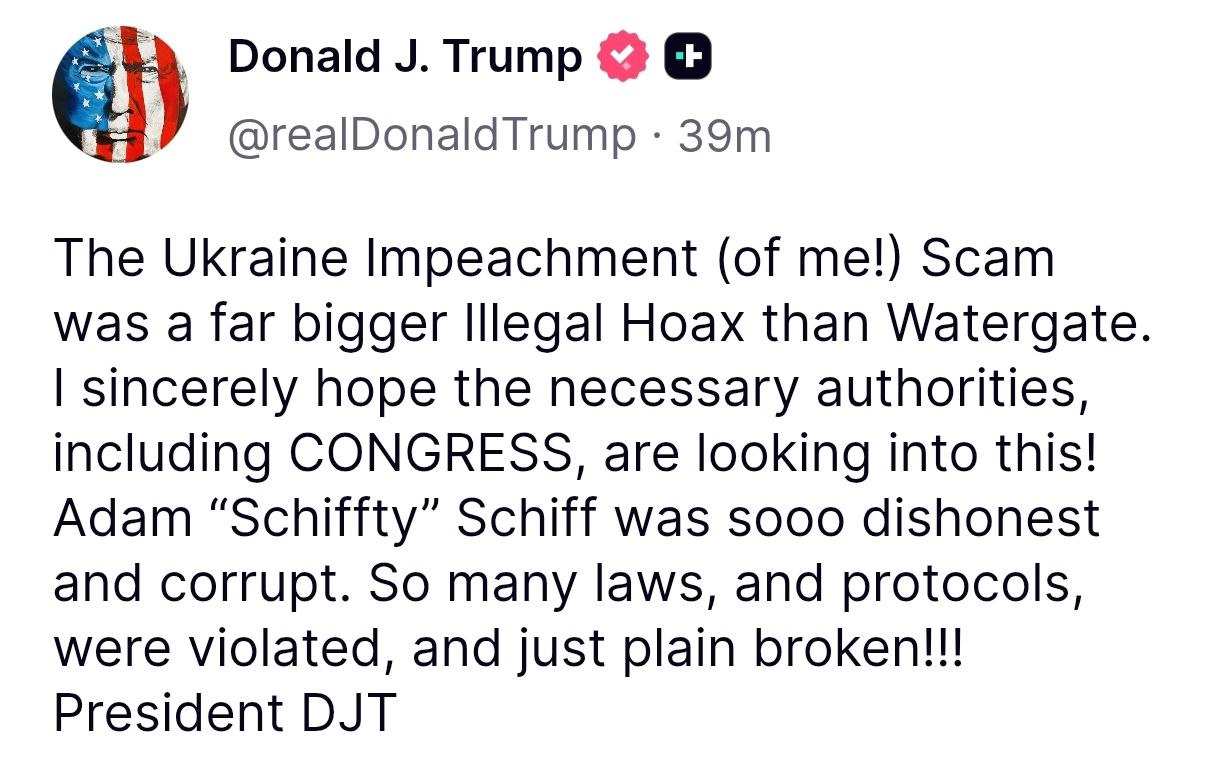 "Украинский импичмент (в отношении меня!) был гораздо более незаконным обманом, чем Уотергейт. Я искренне надеюсь, что соответствующие органы, включая конгресс, расследуют это! Адам Шифф был настолько нечестным и коррумпированным. Было нарушено и попросту попрано столько законов и процедур!" – написал президент США.