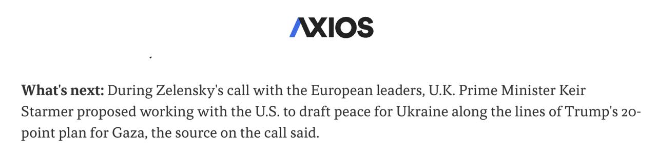 "Стармер предложил работать с США над проектом мира для Украины в соответствии с планом Трампа из 20 пунктов по Газе", - пишет Axios.