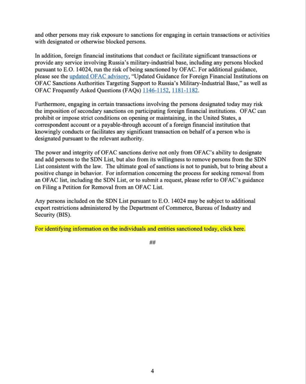 Управление по контролю иностранных активов OFAC отдельно предупреждает, что иностранные финансовые учреждения, которые проводят или содействуют значительным сделкам с компаниями, включёнными в санкционные списки, подвергаются риску вторичных санкций. К таким мерам могут относиться запрет на открытие и ведение корреспондентских счетов в США, ограничения на доступ к долларовым расчётам и другие формы финансовой изоляции.