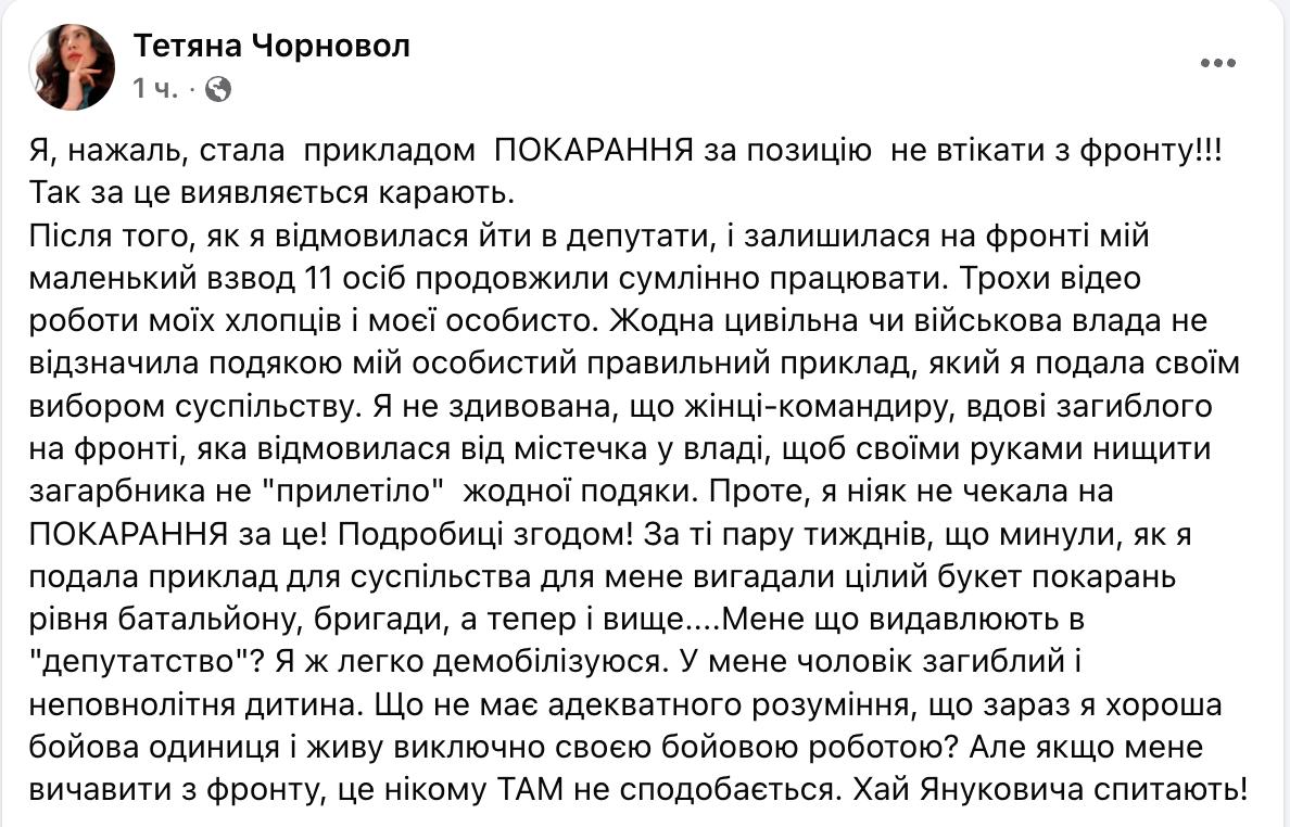 "Я не удивлена, что женщине-командиру, которая отказалась от местечка во власти, чтобы своими руками уничтожать захватчика, не "прилетело" ни одной благодарности. Однако я никак не ожидала наказания за это! Подробности позже! Для меня придумали целый букет наказаний уровня батальона, бригады, а теперь и выше", - написала Черновол.