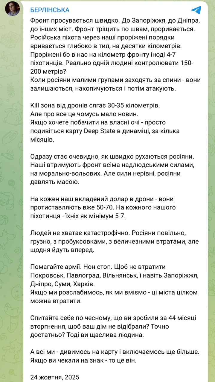 "Фронт продвигается быстро, трещит по швам, прорывается. Российская пехота через наши прореженные порядки врывается глубоко в тыл, на десятки километров. Потому что у нас на километр фронта иногда 4-7 пехотинцев. Реально ли одному человеку контролировать 150-200 метров? Когда россияне малыми группами заходят за спины, они остаются, накапливаются и затем атакуют. Kill-зона от дронов достигает 30-35 км. На каждый наш вложенный доллар в дроны они противопоставляют уже 50-70. На каждого нашего пехотинца их как минимум 5-7. Людей не хватает катастрофически. Россияне медленно, грузно, с пробуксовками, с огромными потерями, но каждый день идут вперед", - написала Берлинская.