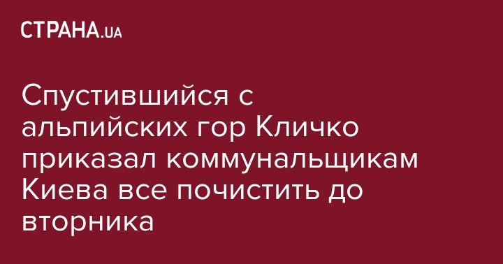 Мэр Киева Виталий Кличко, наконец-то вернувшийся с отдыха в Альпах к работе, дал указание до завтра, 10 января, расчистит столицу от снега. Об этом он заявил на совещании с главами районов, руководством "Киевавтодора", "Киевпастранса", "Киевтранспарксервиса" и руководителями районных ДЭУ, передает пресс-служба КГГА.