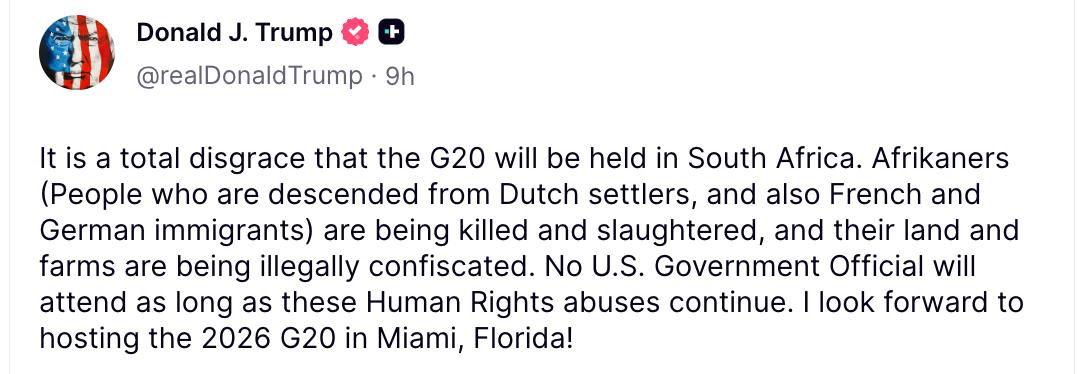 "Это полное позорище, что саммит G20 будет проходить в Южной Африке. Африканеры убиваются и подвергаются резне, их земля и фермы незаконно конфискуются", — сказал американский президент.