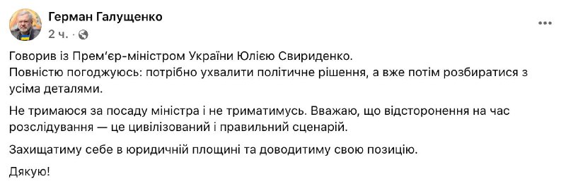"Полностью согласен: нужно принять политическое решение, а уже потом разбираться со всеми деталями. Я не держусь за должность министра и держаться не буду. Считаю, что отстранение на время расследования - это цивилизованный и правильный сценарий. Буду защищать себя в юридической плоскости и доказывать свою позицию", - написал Галущенко в Фейсбуке.