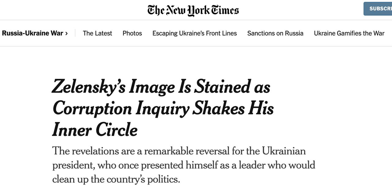 "Эти разоблачения стали для господина Зеленского разительным поворотом событий. Когда-то он создавал себе имидж лидера, который сделает украинскую политику более открытой, избавившись от богатых инсайдеров, известных как олигархи. Теперь, спустя почти семь лет после последних выборов, и поскольку из-за войны новых выборов не предвидится, многие украинцы считают, что он действует в узком, замкнутом кругу и не подчиняется правилам", - говорится в статье.