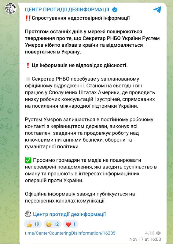 Вскоре после появления публикации Центр противодействия дезинформации при СНБО опроверг, что секретарь ведомства отказывается возвращаться в Украину. В центре заявили, что Умеров уже находится в США, где "проводит ряд рабочих консультаций и встреч, направленных на усиление международной поддержки Украины", "остается в постоянном рабочем контакте с руководством государства, выполняет все поставленные задачи и продолжает работу над ключевыми вопросами безопасности, обороны и гуманитарной политики".