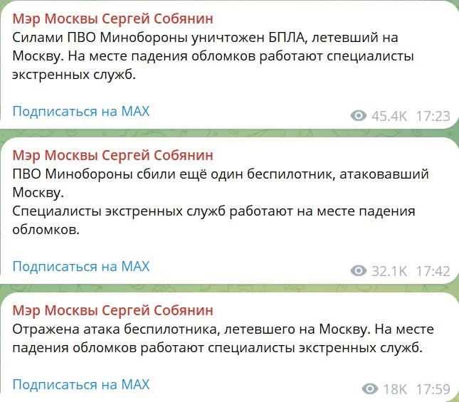 18.16 Москву атаковали беспилотники, сообщает мэр города Собянин.