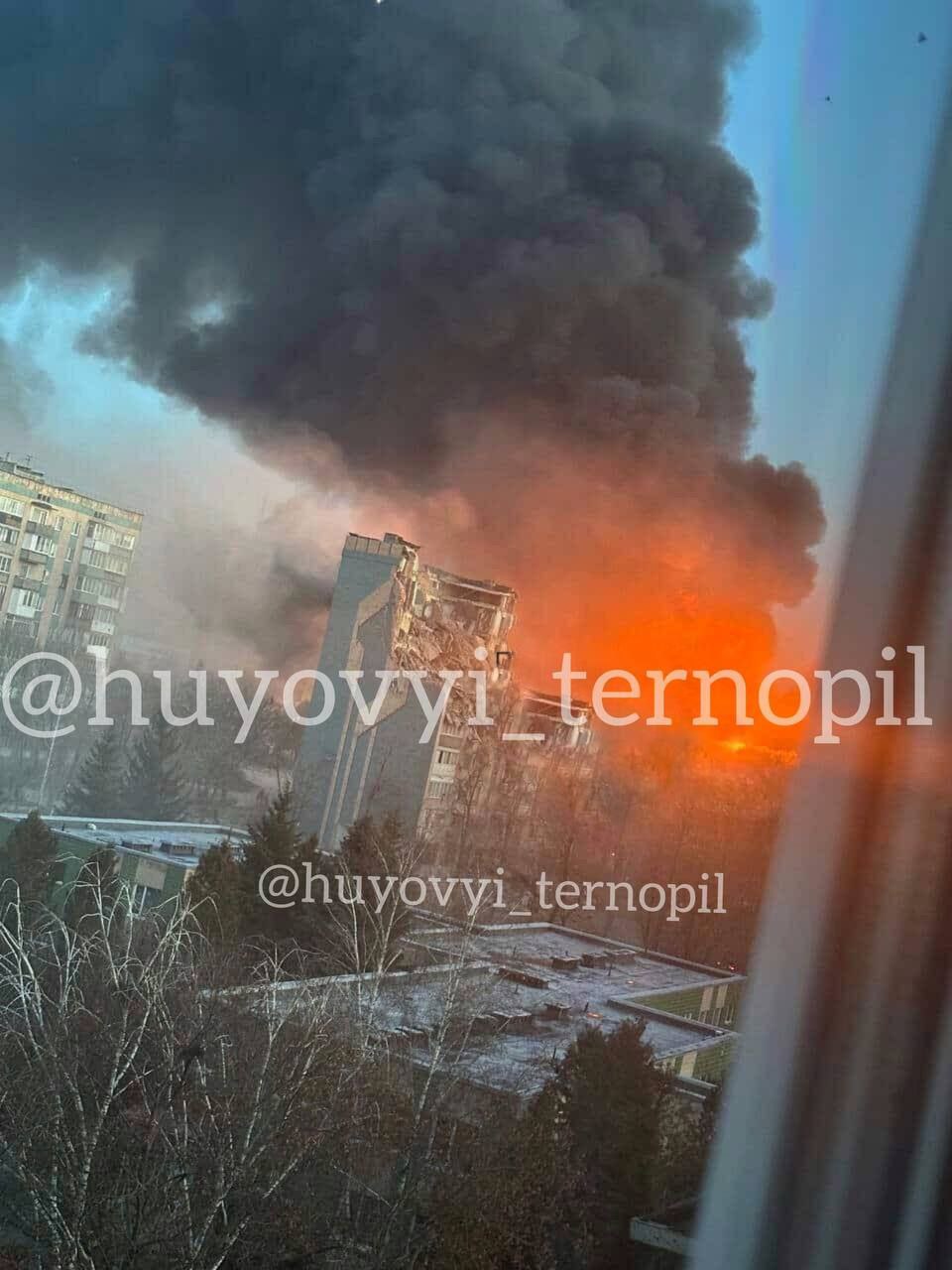 В Тернополе обстрелом повредило многоэтажку. У дома нет крыши, разрушены несколько верхних этажей.