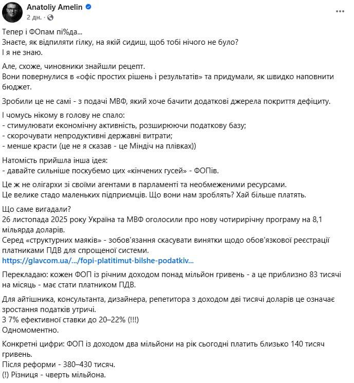 Зато пришла другая идея: давайте сильнее пощипаем этих "конченых гусей" – ФОПов", - пишет Амелин.