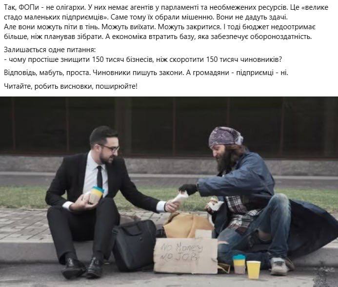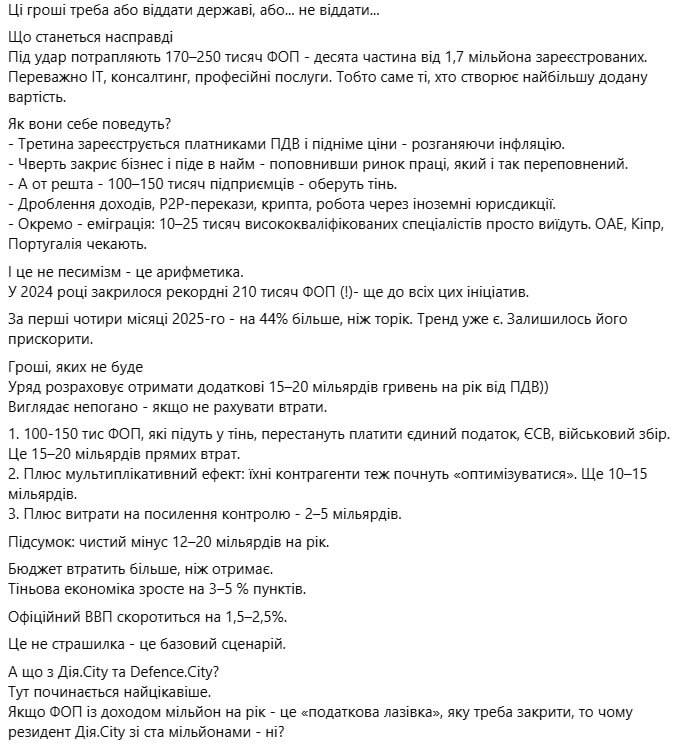 "Теперь и ФОпам п%зда... Знаете, как отпилить ветку, на которой сидишь, чтобы тебе ничего не было? Я не знаю. Но, похоже, чиновники нашли рецепт. Они вернулись в «офис простых решений и результатов" и придумали, как быстро наполнить бюджет. Сделали это не сами – с подачи МВФ, желающего видеть дополнительные источники покрытия дефицита. И почему-то никому в голову не пришло: