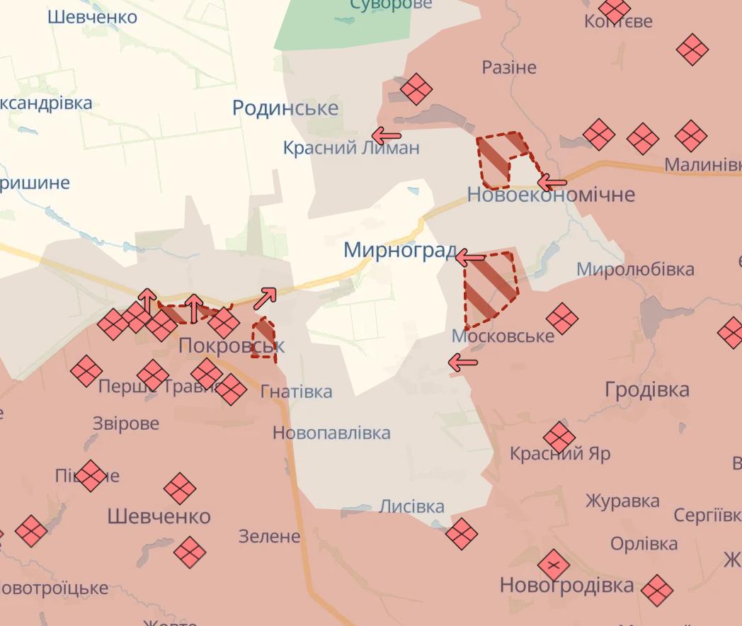 Он подтверждает данные Deep State о присутствии российских сил на перешейке, по которому идёт логистика. Из-за этого бойцы при попытке провести ротацию вступают в ближний бой с россиянами и отступают. По его словам, защитники Мирнограда могут лишь наблюдать за россиянами, но им нечем больше их атаковать.