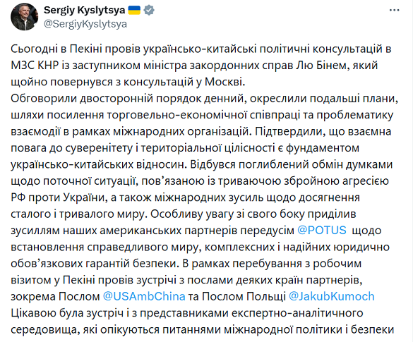 Заместитель главы МИД Украины Сергей Кислица прилетел в Китай, где встретился с послом США Дэвидом Пердью и заместителем министра иностранных дел КНР Лю Бинем.