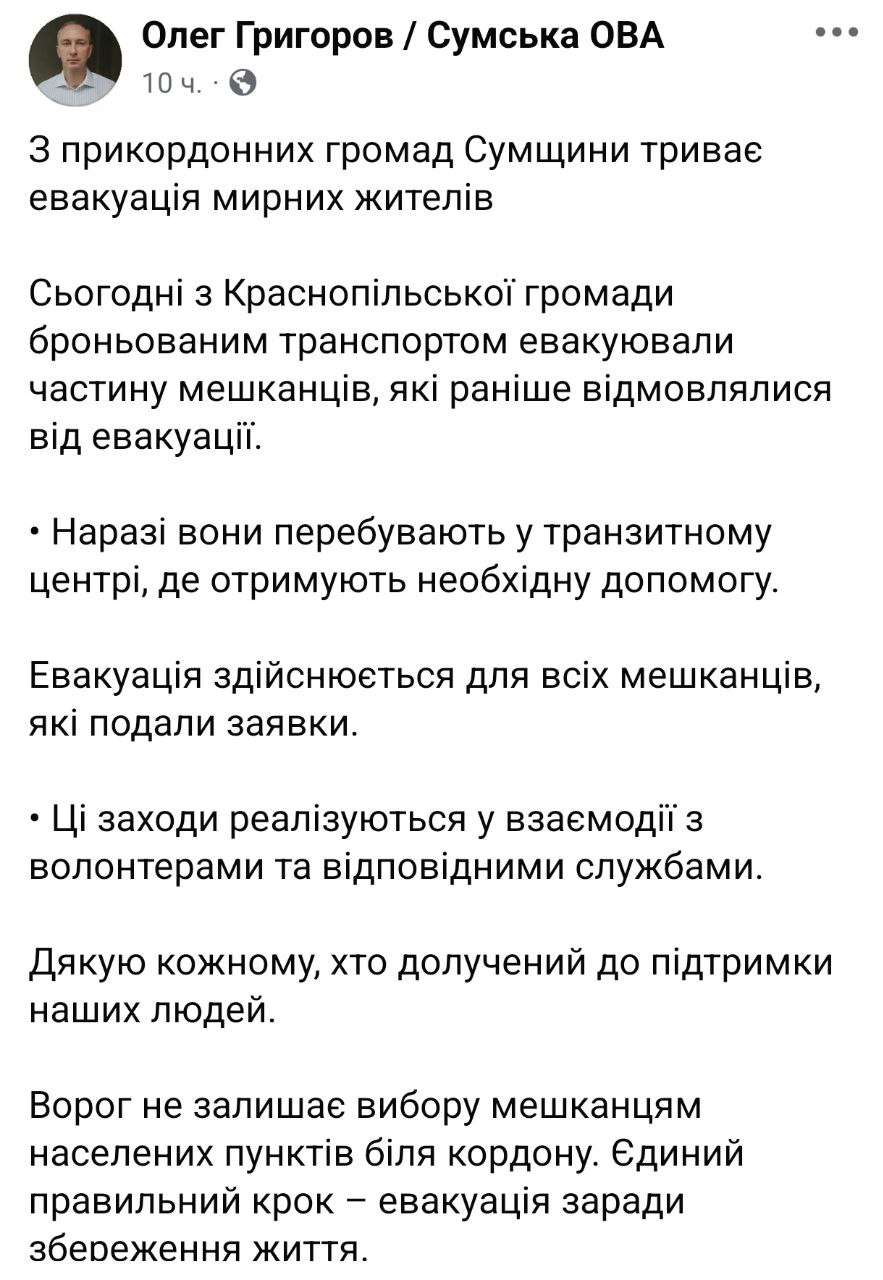 8:35 Власти Сумской области объявили об усиленной эвакуации из Краснопольского района, где россияне, по данным СМИ, перешли границу у села Грабовское.