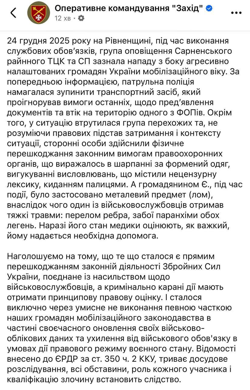 В Ровенской области группа мужчин напала на сотрудников Сарненского территориального центра комплектования и социальной поддержки. Один из военкомов в результате получил перелом ребра.