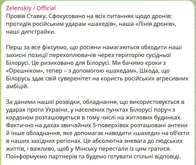 Сегодня Зеленский также сказал, что "Шахеды" стали обходить украинскую ПВО благодаря Беларуси.