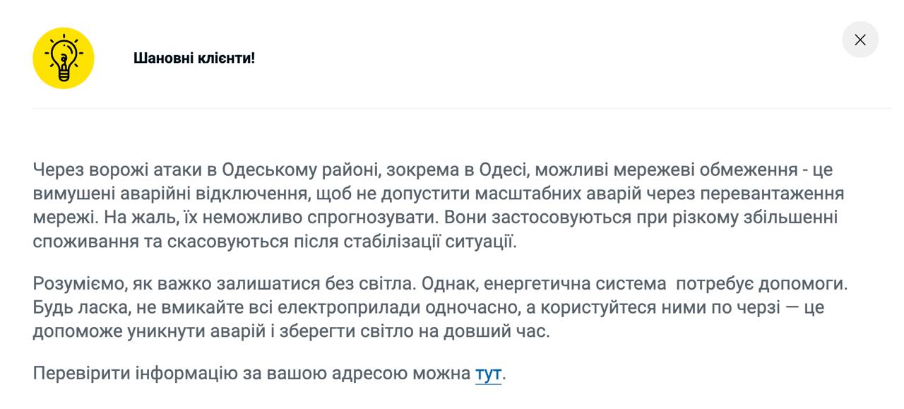 8.21 В Одессе сохраняются аварийные отключения света, ситуацию невозможно прогнозировать, сообщает ДТЭК.