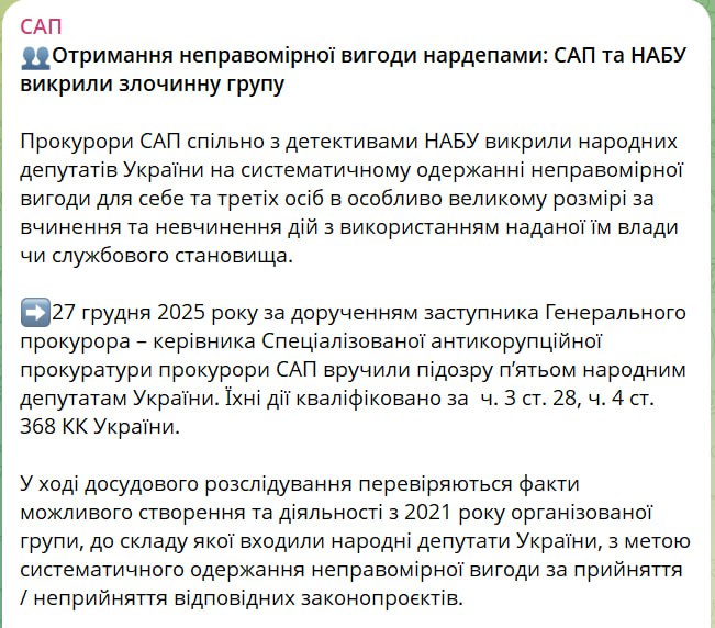 Специализированная антикоррупционная прокуратура сообщает подробности коррупционных схем в парламенте, по которой вручили подозрения пяти народным депутатам из партии "Слуга народа".