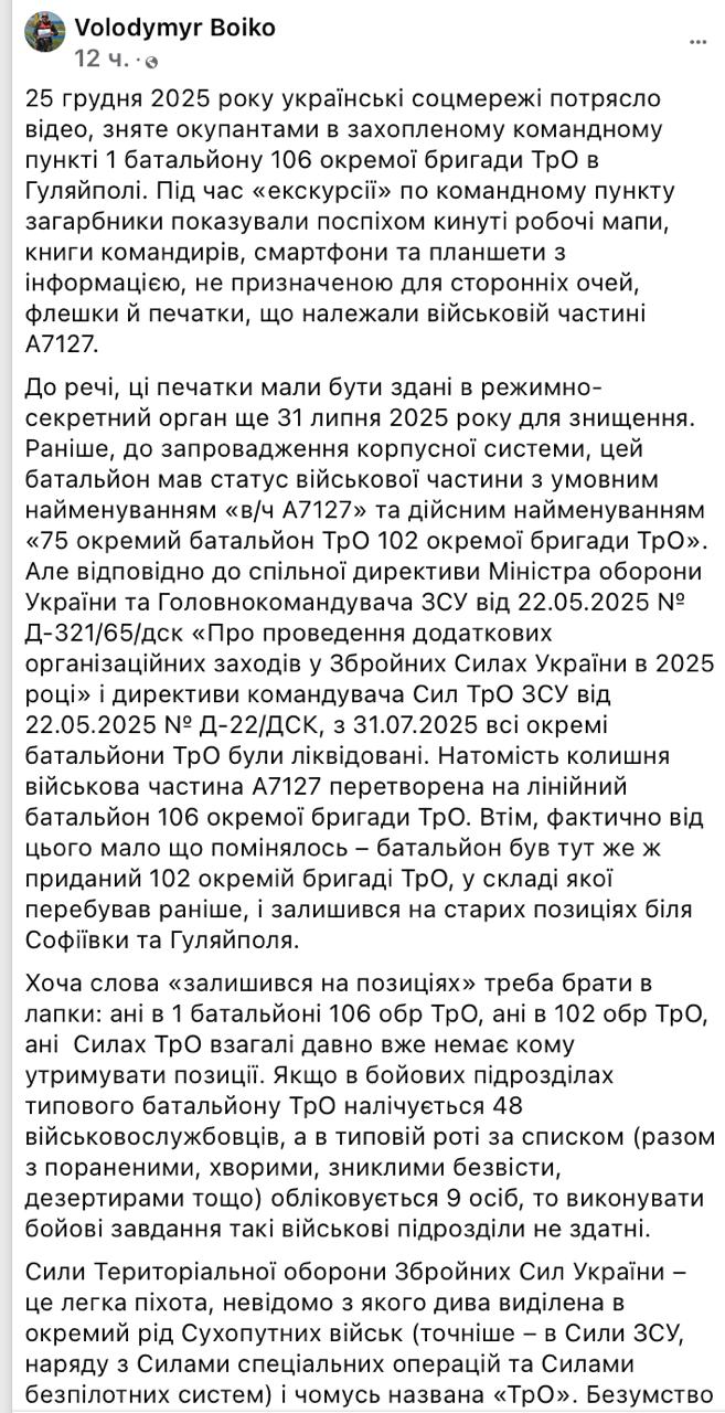 Он пишет, что в ТрО "давно некому" держать фронт.