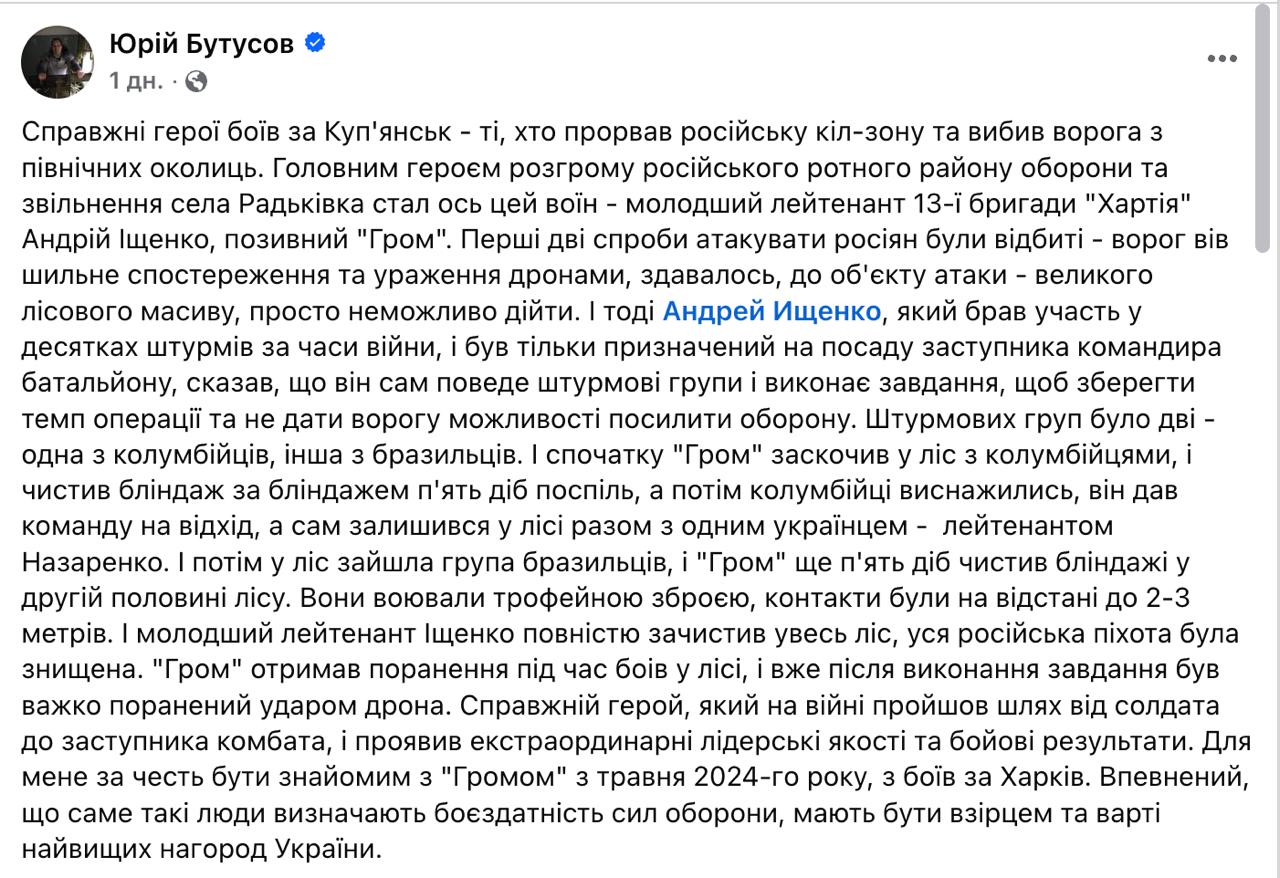 "Штурмовых групп было две: одна из колумбийцев, другая из бразильцев. И сначала Гром заскочил в лес с колумбийцами и чистил блиндаж за блиндажом пять суток подряд, а потом колумбийцы истощились, он дал команду на уход, а сам остался в лесу вместе с одним украинцем - лейтенантом Назаренко. И потом в лес зашла группа бразильцев, и Гром еще пять суток чистил блиндажи во второй половине леса. Они сражались трофейным оружием, контакты были на расстоянии до 2-3 метров", - описал происходившее Бутусов.