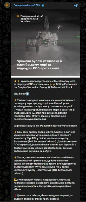16:10 Генштаб ВСУ заявляет о поражении трех буровых установок "Лукойл" в Каспийском море.