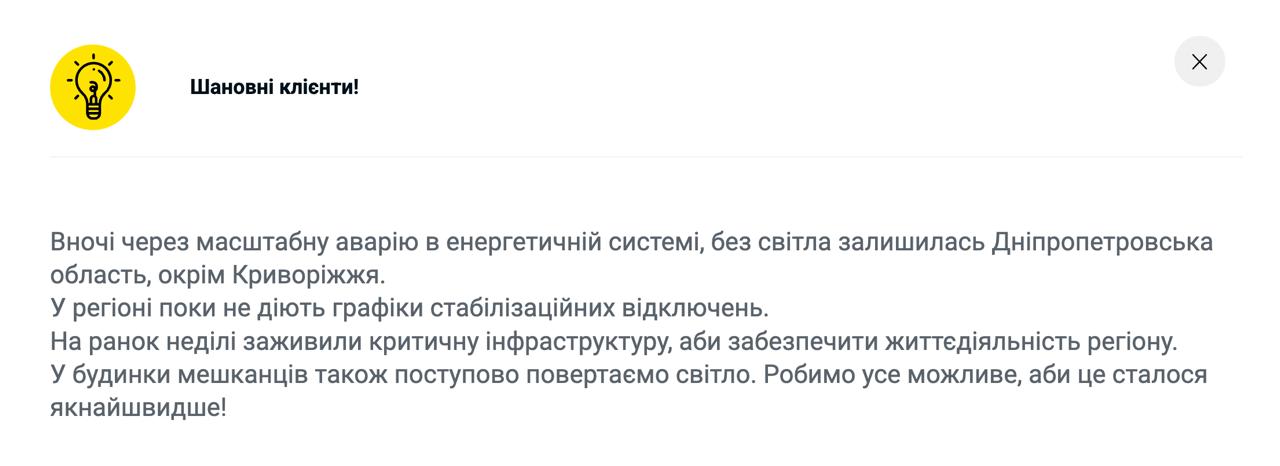 9:58 В Днепропетровской области ночью произошла авария в энергосистеме. Графики отключений не действуют.