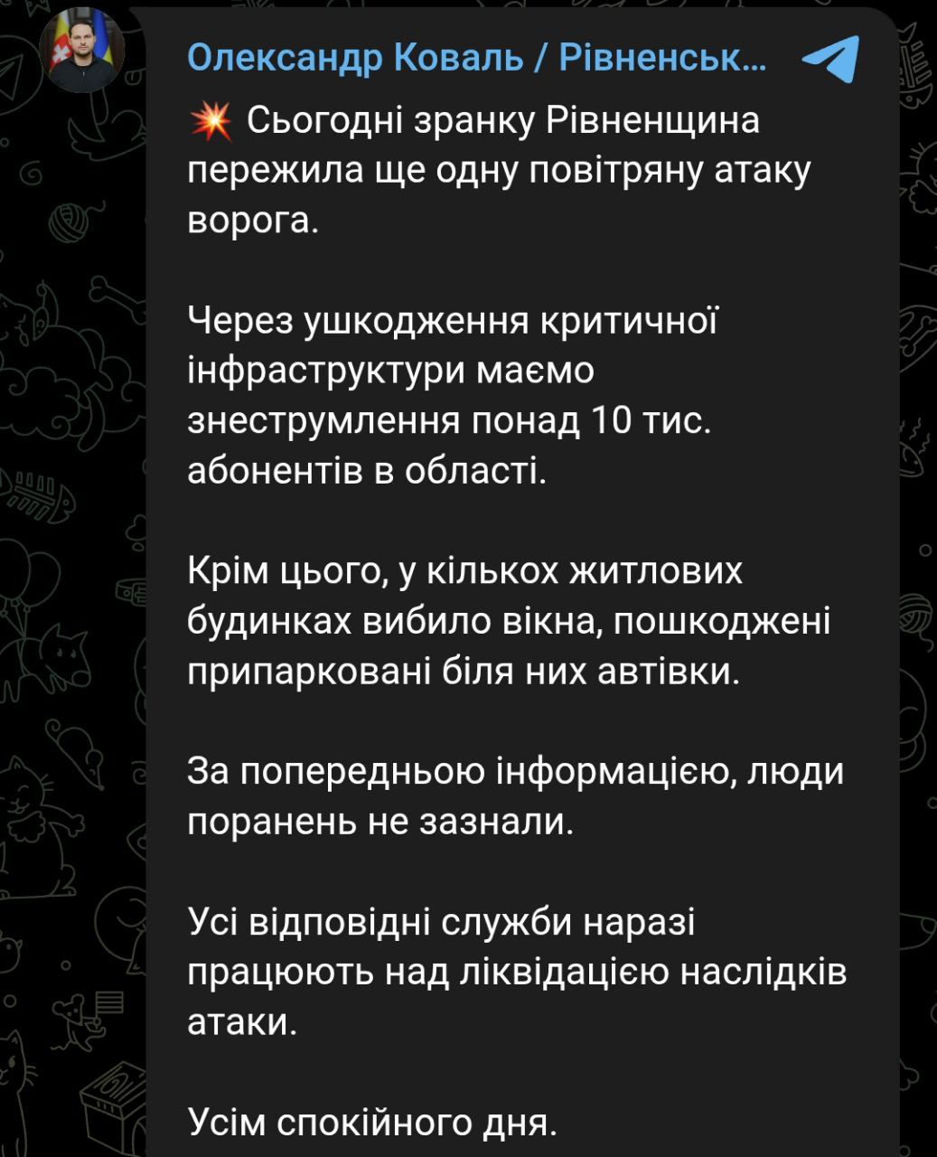 9.17 В Ровенской области 10 тысяч домохозяйств остались без света после удара по критической инфраструктуре, заявил губернатор.