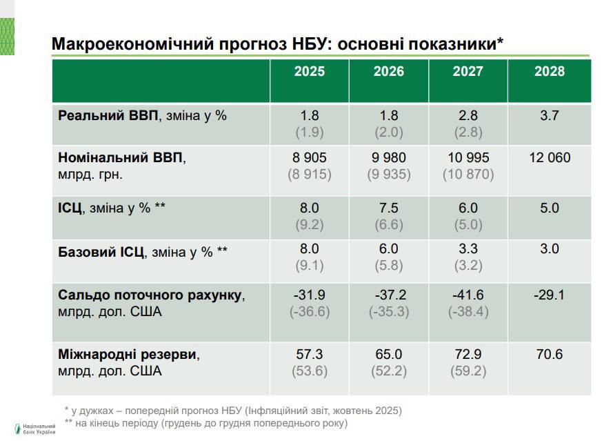 "Разрушение логистики и больший, чем ожидалось, дефицит электроэнергии за последние месяцы НБУ несколько снизил оценку роста реального ВВП в 2025 году — до 1,8%. Наращивание урожаев и инвестиции в восстановление инфраструктуры и оборонный комплекс обеспечат дальнейшее восстановление экономики. Однако усложнение ситуации в энергосекторе еще долгое время будет ограничивать деловую активность. Учитывая это, реальный ВВП в 2026 году вырастет умеренно — на 1,8%. Постепенное улучшение ситуации в энергосекторе, дальнейшее восстановление инфраструктуры, а также увеличение частных инвестиций будут способствовать ускорению экономического роста до 3-4% в 2027-2028 годах", - считает Андрей Пышный.