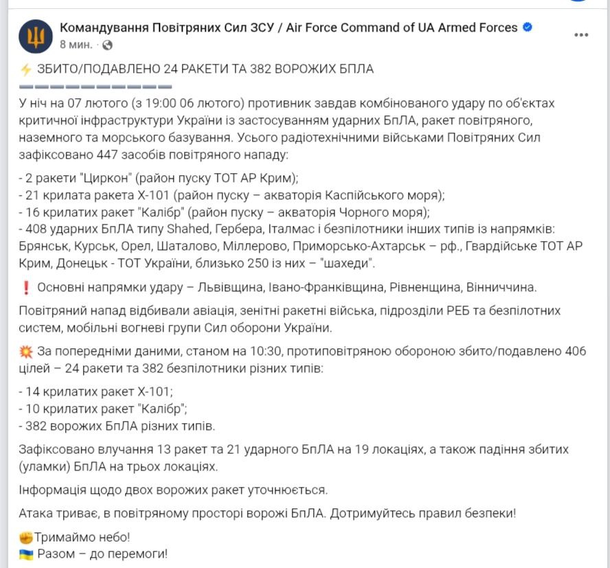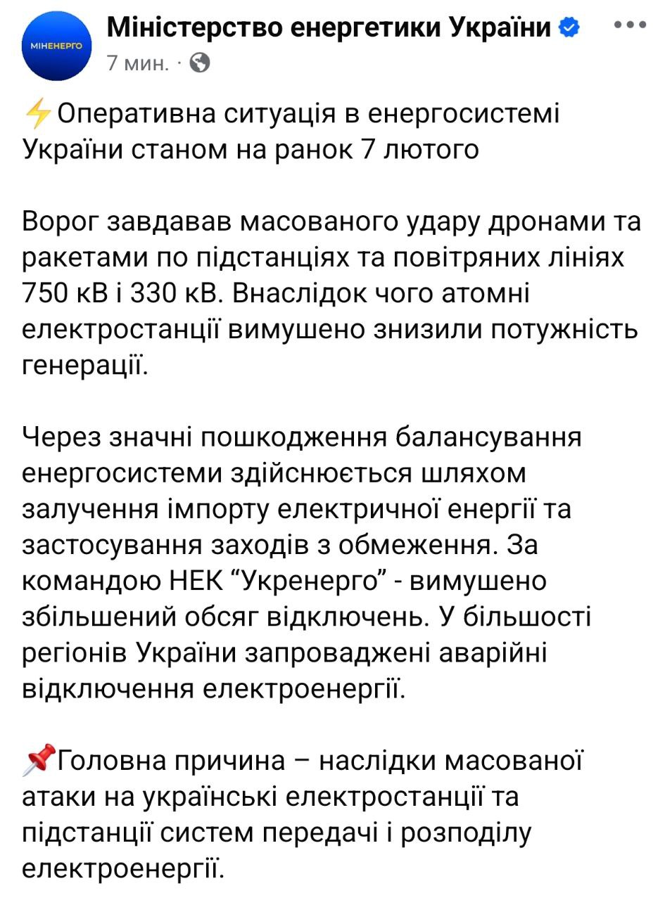 8:48 Целью сегодняшнего удара стали подстанции и воздушные линии электропередачи напряжением 750 и 330 кВ — основа энергосистемы Украины.