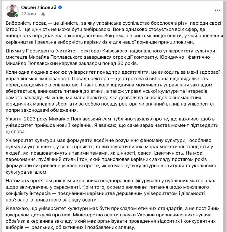 Напомним, в 2023 году Поплавский заявлял, что уходит с должности ректора КНУКиИ и хочет передать полномочия молодому преемнику, а сам готов стать главой учёного совета. Но в итоге остался на должности.