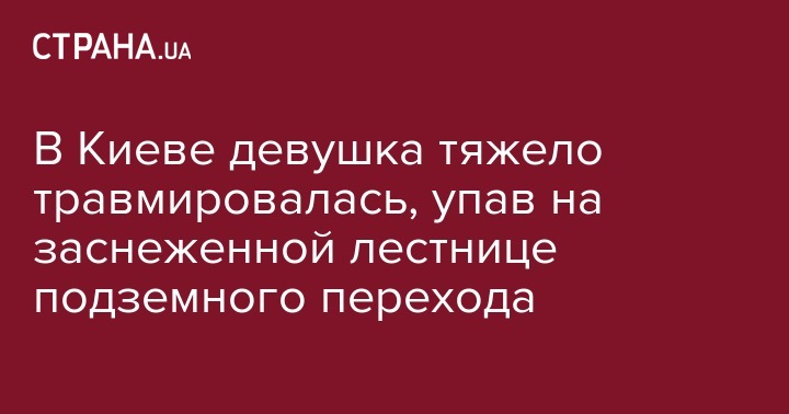 Инцидент произошел в Шевченковском районе Киева на улице Выборгской. 16-летняя девушка получила тяжелые травмы, пытаясь спуститься в подземный переход по заснеженной лестнице, которую никто не убирал. Пострадавшую срочно госпитализировали медики скорой.