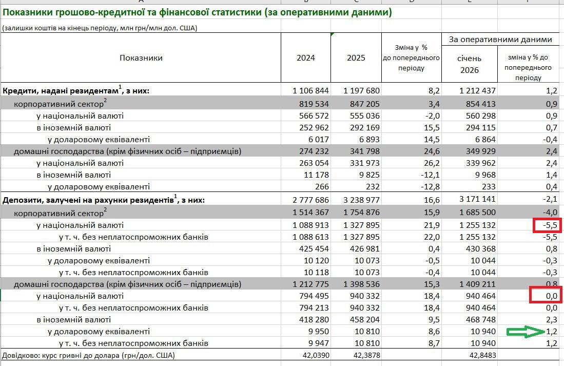 Национальный банк Украины опубликовал отчет за январь 2026 года, из которого видно, что в прошлом месяце накопления бизнеса в гривне сократились на 5,5% (до 1,26 трлн грн), а населения — почти не выросли (держатся на 940 млрд грн), в отличии от предыдущих месяцев, когда прирастали по 1,5-2% и на 18,4% по итогам всего 2025 года.