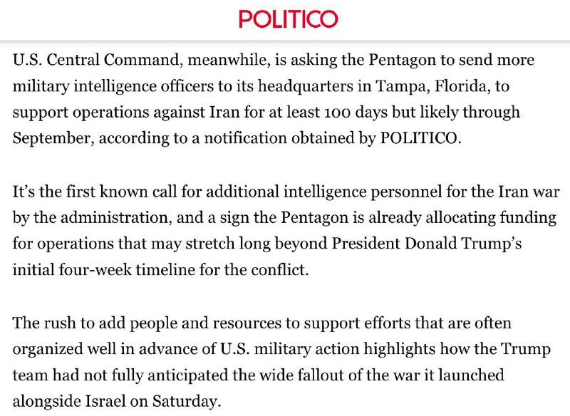 Центральное командование США запросило у Пентагона дополнительный персонал военной разведки для поддержки операций против Ирана как минимум на 100 дней, а вероятно до сентября. То есть война на Ближнем Востоке может продлиться до осени.