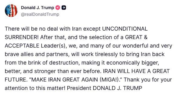 "Никакого соглашения с Ираном не будет, кроме безоговорочной капитуляции! После этого и выбора великого и приемлемого лидера(ов) мы, а также многие из наших замечательных и очень храбрых союзников и партнёров будем неустанно работать, чтобы вернуть Иран с края разрушения, сделав его экономически больше, лучше и сильнее, чем когда-либо прежде. У Ирана будет великое будущее. Сделаем Иран снова великим", - написал президент США.