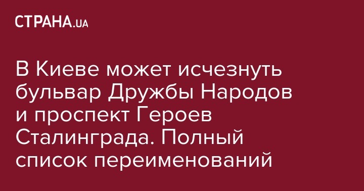 Среди прочих, городским депутатам предложили переименовать бульвар – Дружбы Народов в бульвар Николая Михновского в Печерском районе, а также бул. Михаила Кольцова — в бул. Николая Руденко в Святошинском районе, а также проспект Героев Сталинграда в проспект. Владимира Ивасюка в Оболонском районе.