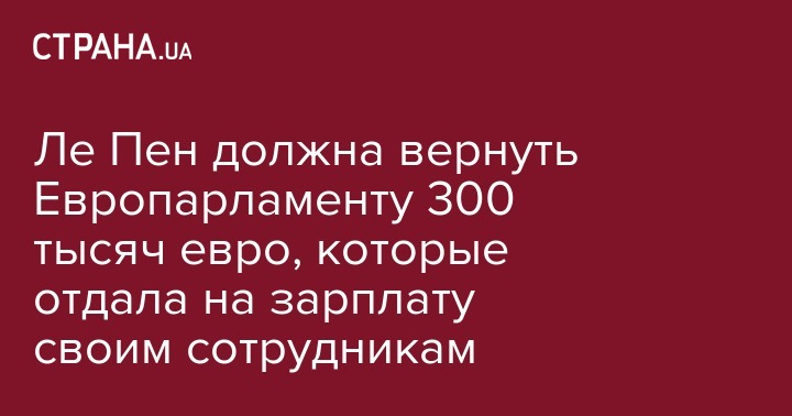 Ле Пен обязали до 31 января вернуть Европейскому парламенту 298 тысяч евро, а до 28 февраля лидер французских правопопулистов должна будет заплатить еще 42 тысячи евро. В противном случае деньги будут вычитывать из ее выплат со стороны Европарламента.