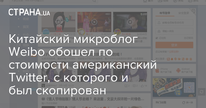 Капитализация (совокупная биржевая стоимость всех акций) китайского сервиса микроблогов Weibo превысила аналогичный показать у Twitter, который и был взят китайцами за основу при разработке.