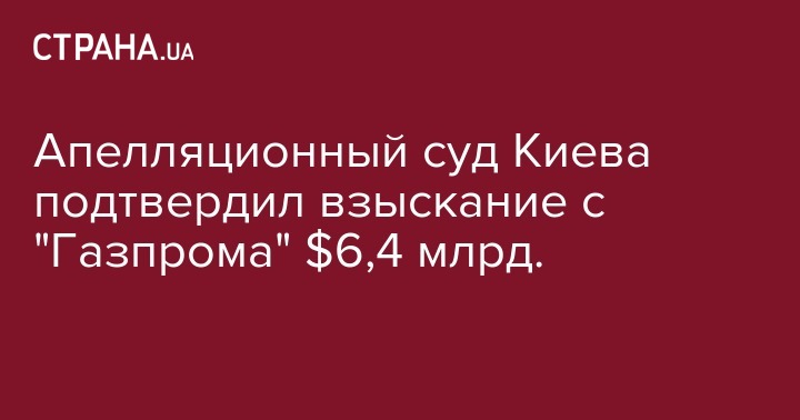 Решение Хозяйственного суда Киева от 5 декабря 2016 года о взыскании с газового монополиста "Газпрома" 172 млрд грн. (порядка 6,4 млрд долларов по текущему курсу) штрафа и пени остается в силе. Об этом сообщают "Украинские новости" со ссылкой на Киевский апелляционный хозяйственный суд. Соответствующее решение зачитала председательствующий судья Каролина Тарасенко.