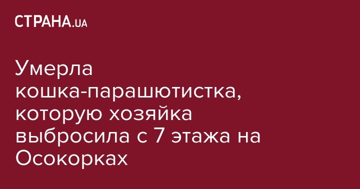 Кошка, которую прозвали Парашютисткой после того, как хозяйка выбросила ее с 7 этажа на Осокорках в Киеве вместе с ребенком, а затем выпрыгнула сама, умерла. Об этом сообщил в Facebook журналист Влад Антонов.