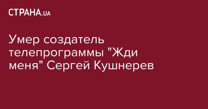 Скончался российский журналист и телепродюсер, создатель программ "Жди меня", "Последний герой" и многих других Сергей Кушнерев. Об этом в Facebook сообщил гендиректор радиостанции "Говорит Москва" Владимир Мамонтов.