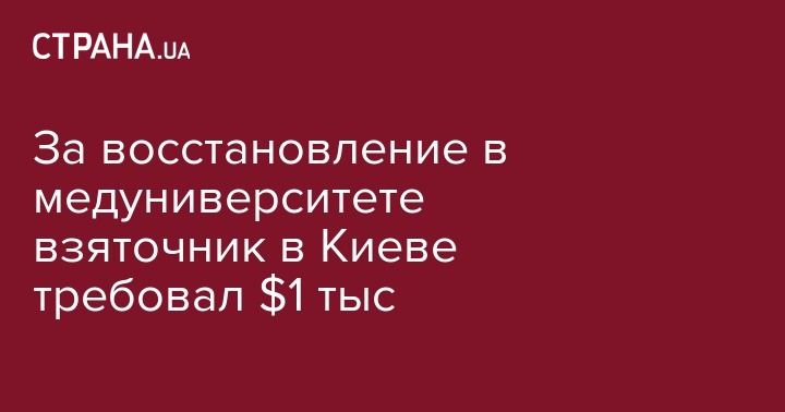 Оперативники Управления защиты экономики Нацполиции зафиксировали факт вымогательства и получения сотрудником заведения неправомерной выгоды. Чтобы студент возобновил свое обучение в медуниверситете, его мать должна была уплатить тысячу долларов "благотворительного взноса", сообщает пресс-служба Нацполиции.