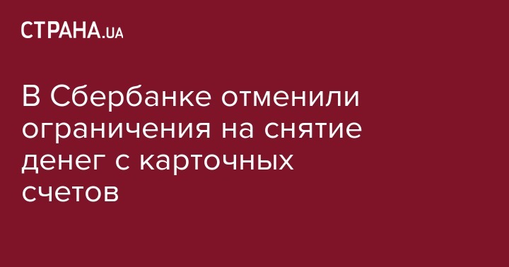 Сбербанк (Киев) с 28 марта снял ранее установленные суточные лимиты на проведение операций с использованием корпоративных карт, сообщил банк на своем веб-сайте. Согласно сообщению, в частности, отменены суточные лимиты на операции с использованием корпоративных карт по снятию наличных средств с карточных счетов и на любые безналичные операции с карточных счетов. Как сообщалось, 28 марта все отделения украинского дочернего банка Сбербанка России разблокированы.