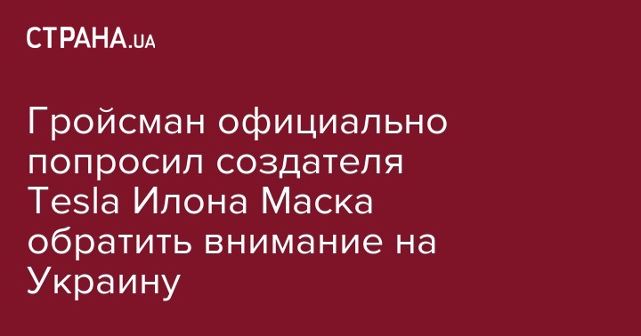 Как сообщалось, премьер-министр Владимир Гройсман предложил в Twitter основателю SpaceX и Tesla Маск сделать Украину испытательным полигоном для инноваций в сфере энергосбережения.
