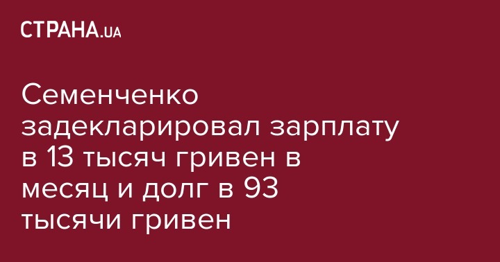 Его жена задекларировала 11 тыс. зарплаты в общественной организации "Объединение жен и матерей бойцов участников АТО", 26 тыс. гривен зарплаты в "Благотворительном фонде Семена Семенченко", а также 30 тыс. гривен дохода от предпринимательской деятельности.