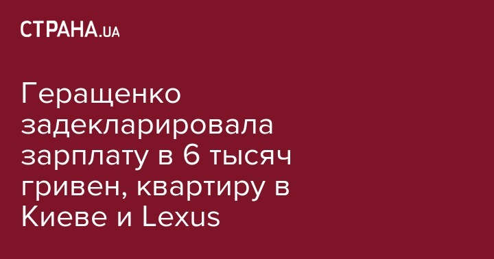 Первый вице-спикер Верховной Рады Ирина Геращенко задекларировала квартиру в Киеве, автомобиль Lexus 2007 года выпуска, ювелирные изделия, швейцарские часы Piaget. Об этом свидетельствуют данные ее электронной декларации на сайте Единого государственного реестра деклараций.