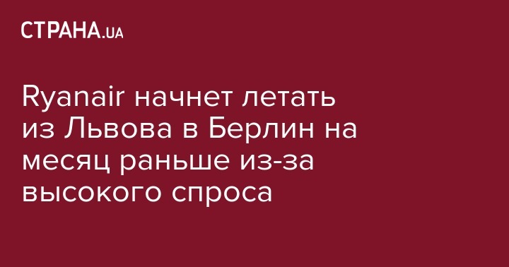 Лоукостер Ryanair сообщает, что первый рейс Львов-Берлин отправится 8 сентября - на месяц раньше, чем планировалось, из-за высокого спроса среди украинцев. Об этом говорится на сайте Ryanair.